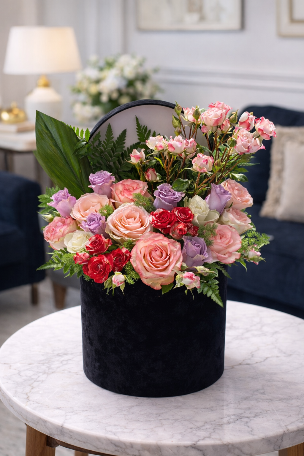 باقة السمو المخملي ليست مجرد ورد… هي قطعة فخامة توضع على الطاولة فتغيّر شكل المكان بالكامل. تدرجات الوردي والمشمشي واللافندر مع الأحمر المخملي داخل بوكس أسود فاخر تعطي مشهدًا بصريًا راقيًا يلفت الانتباه من أول نظرة.