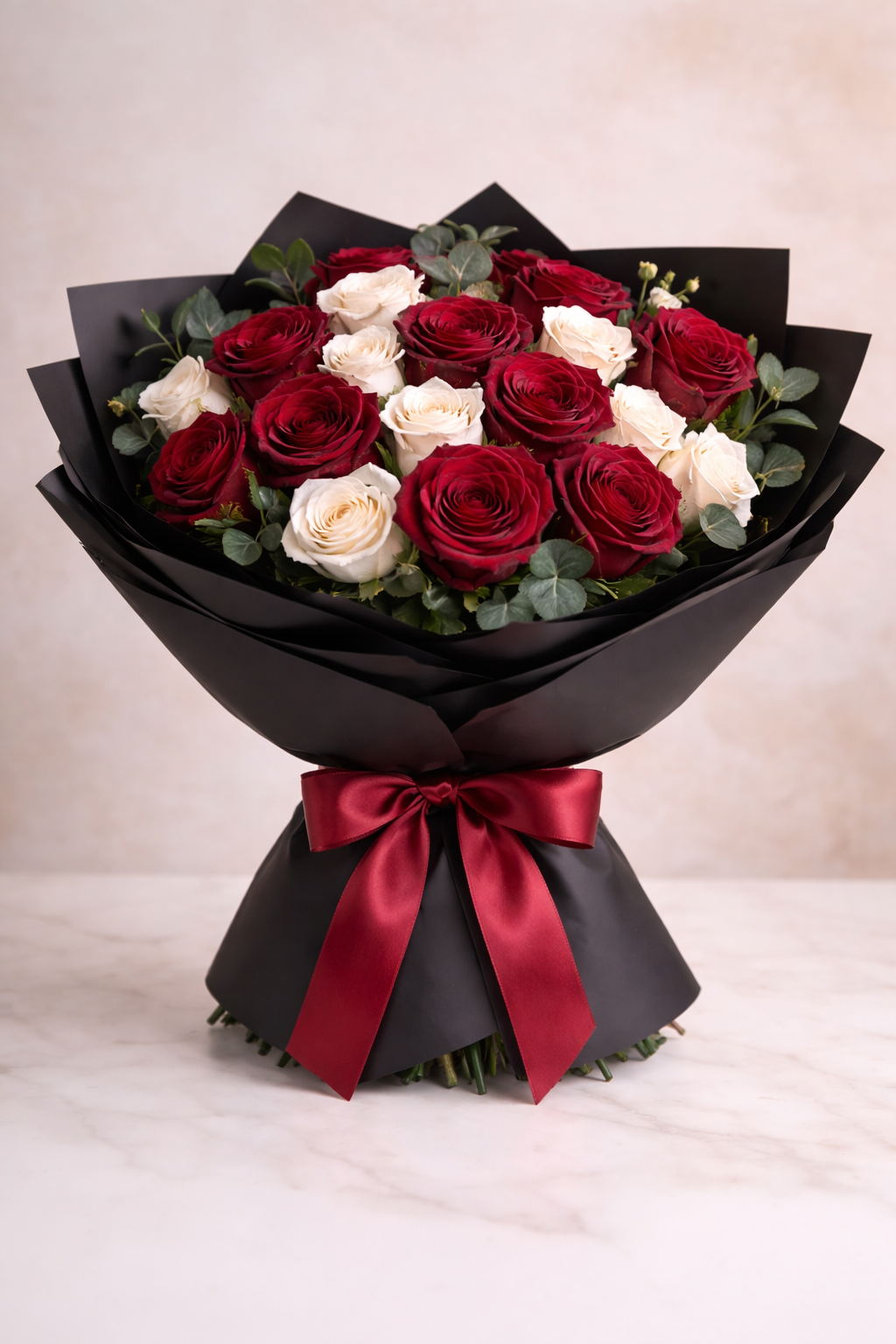 الأحمر الداكن مع الأسود يعطي إحساس بالفخامة والقوة والرقي العالي. باقة تُهدى في المواقف الكبيرة، للأشخاص المهمين، أو في مناسبات تحتاج أثر قوي من أول نظرة.