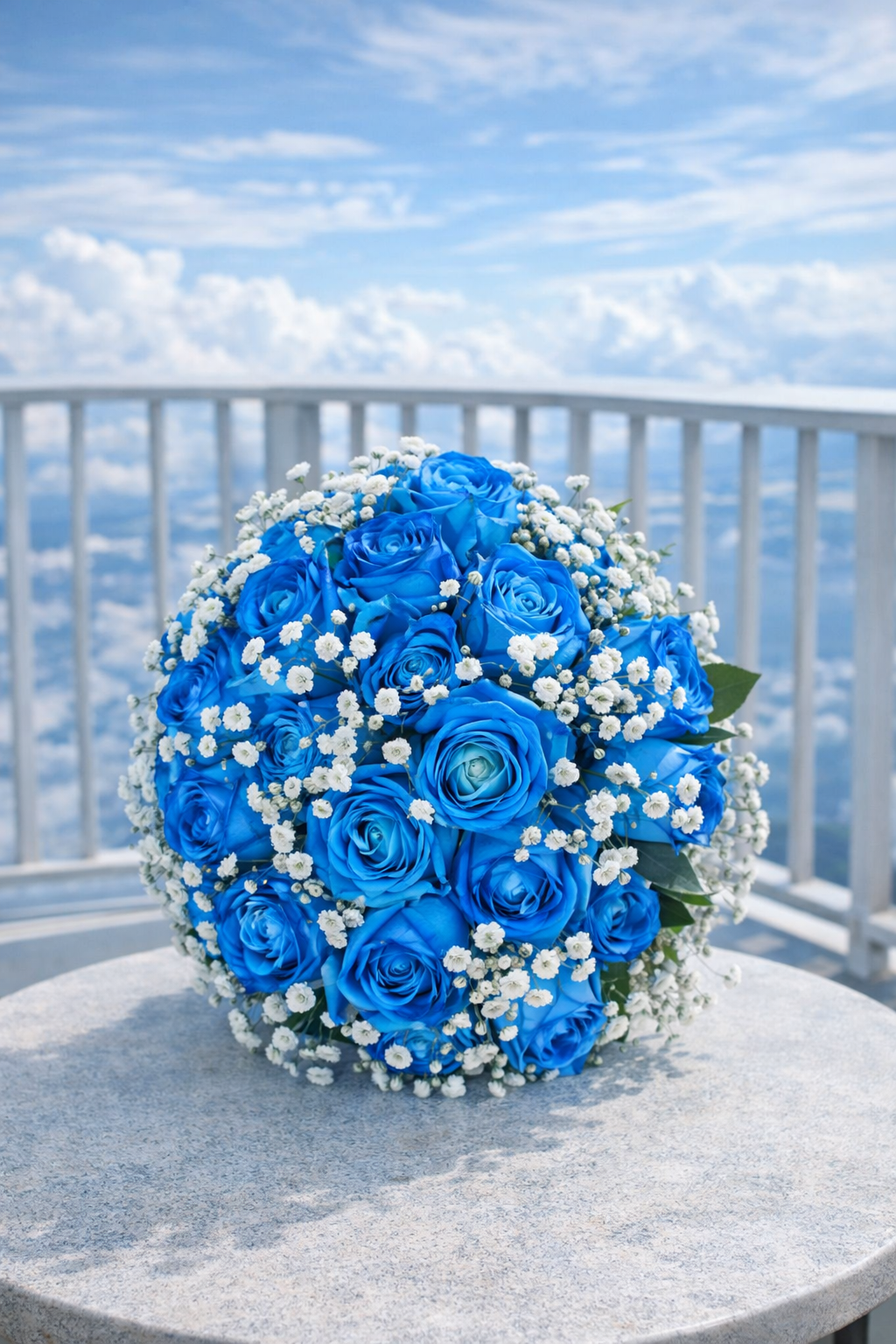 باقة صفاء السماء مستوحاة من هدوء الغيم وجمال السماء الصافية. اللون الأزرق العميق للورد يمنح إحساسًا بالطمأنينة والرقي، بينما تضيف الجبسوفيلا البيضاء لمسة خفيفة تشبه السحب الناعمة حول الباقة.