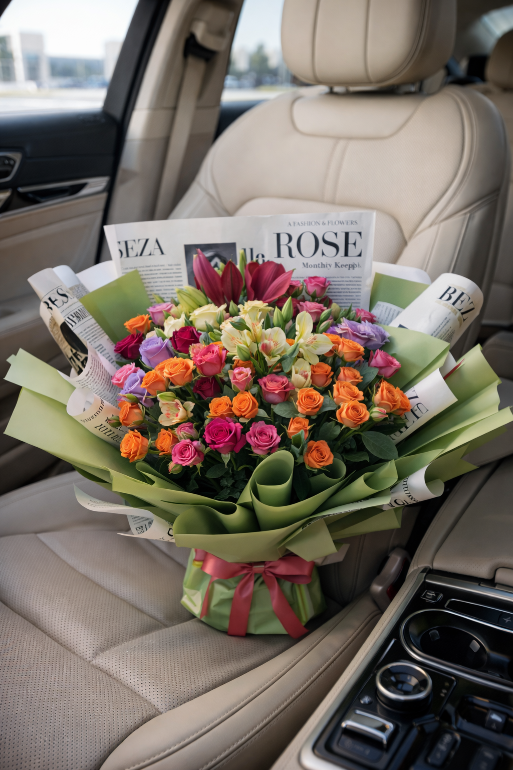 باقة راقية تجمع بين الورود الطبيعية المتنوعة بألوان نابضة بالحياة، منسقة بعناية وتغليف أنيق يعكس الفخامة والذوق العالي.