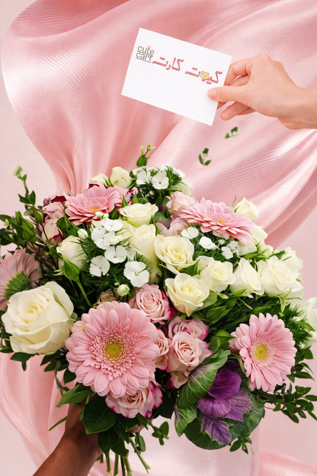 تنسيق أنيق يجمع بين ورد الجربيرا الوردي، الورد الجوري الأبيض، ورد سبراي بلَش، ولمسات بنفسجية خفيفة مع خضرة متوازنة. الإخراج البصري يعتمد على خلفية وردية حريرية تضيف إحساسًا فاخرًا وتبرز تفاصيل الزهور بدقة عالية.