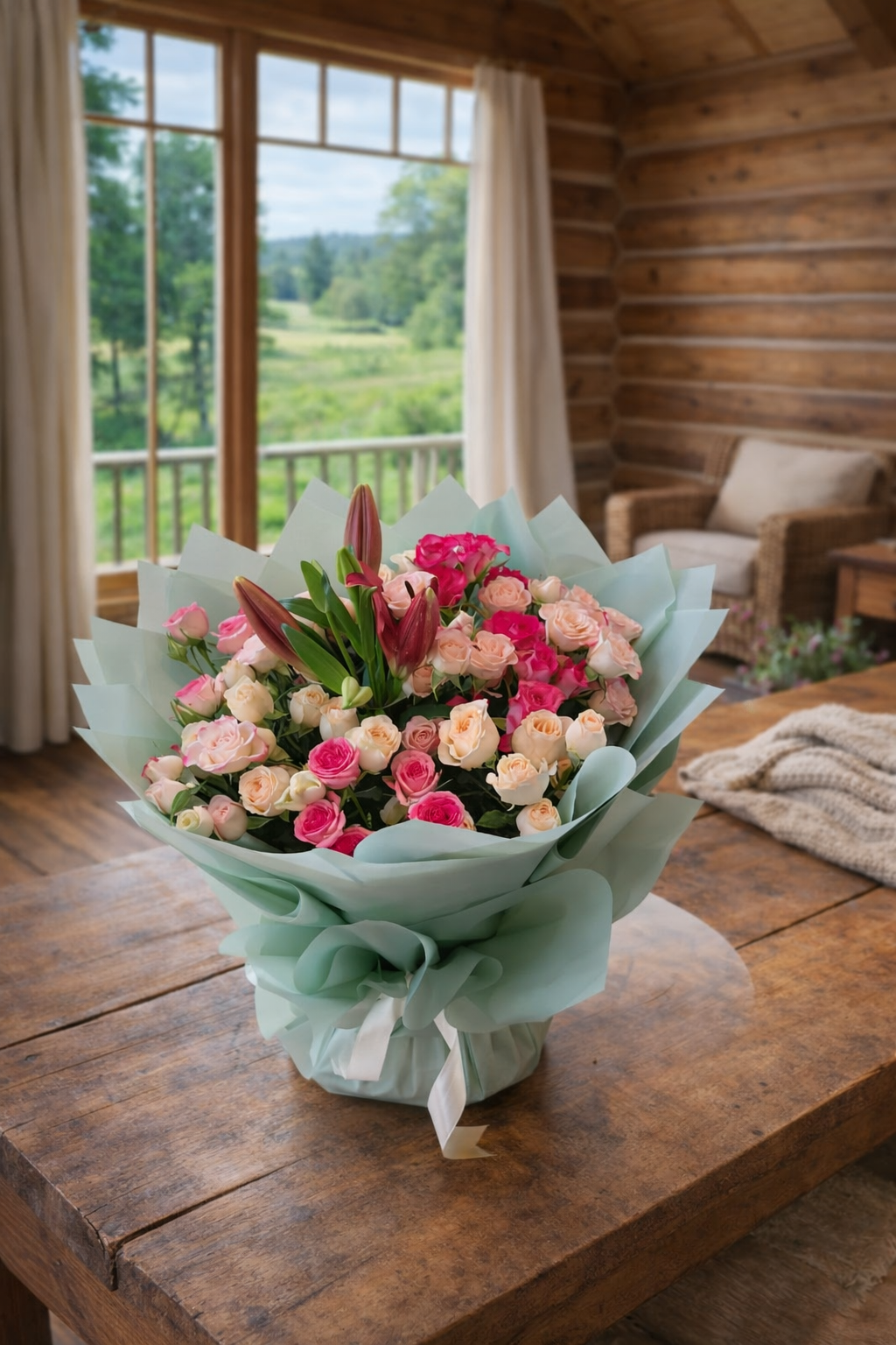 باقة هادئة وفاخرة بتدرجات الوردي والزهري مع لمسات خضراء ناعمة، مصممة بذوق راقٍ يعكس النعومة والأنوثة. تنسيق متوازن يمنح إحساسًا بالانتعاش والدفء في آنٍ واحد، مثالية للإهداء في اللحظات الخاصة.