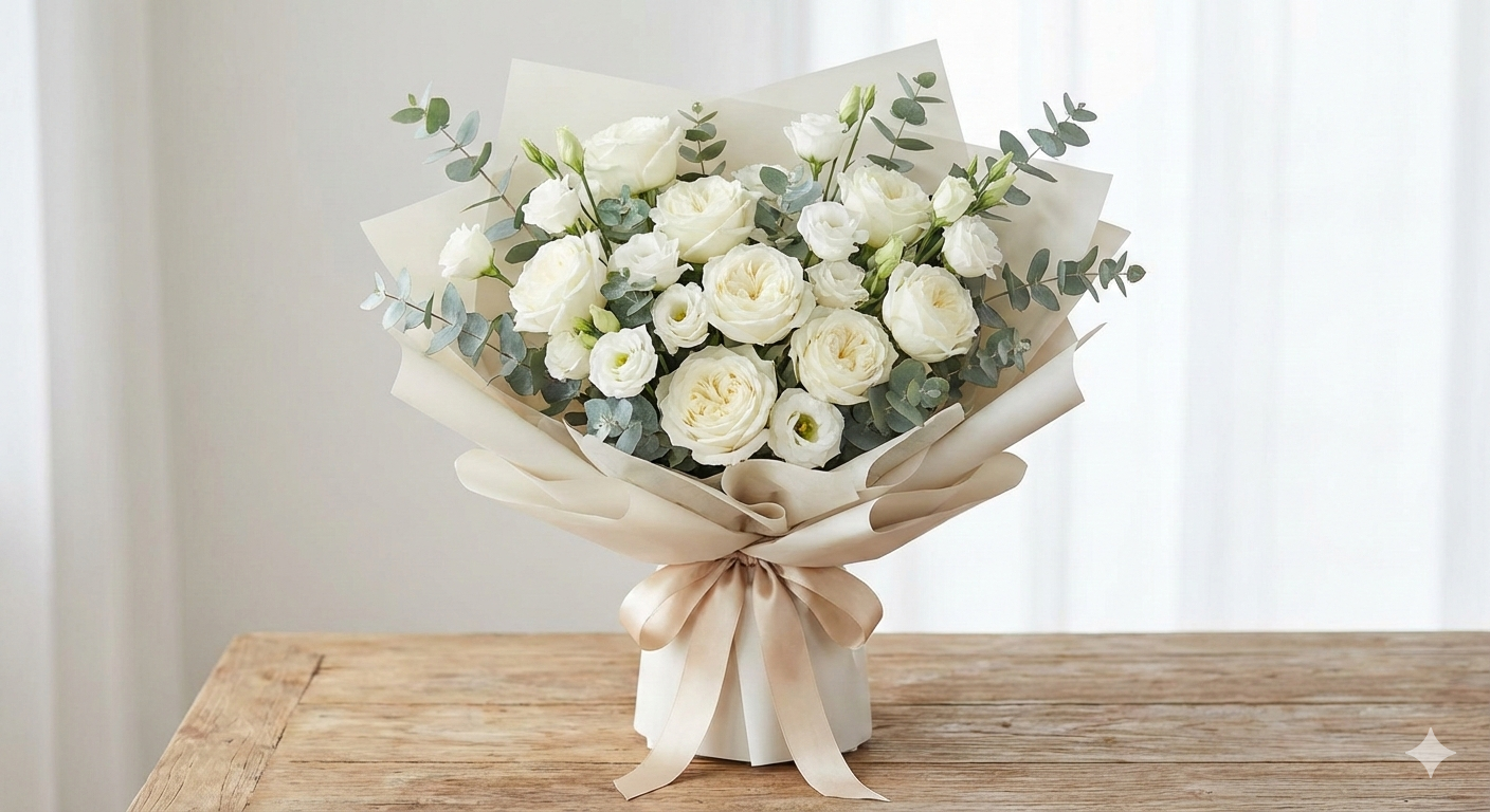 مفهوم الباقة: هذه الباقة هي تجسيد للكلاسيكية الفاخرة. تعتمد على لوحة ألوان أحادية (Monochromatic) من الأبيض والكريمي، مما يعطي شعوراً فورياً بالهدوء، الرقي، والنظافة. هي ليست مجرد باقة، بل هي رسالة صامتة مفعمة بالاحترام والتقدير العميق.